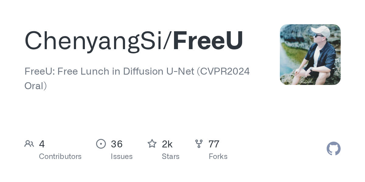 FreeU とは「Free Lunch in Diffusion U-Net」の略で、画質の大幅な向上をもたらす技術の一つです。その名の通り、大きな労力や特別なスキルを必要とせず、手軽に画像の質を向上させることができます。詳しい技術的詳細は、以下の GitHub の公式ページで開発されているので確認することができます。